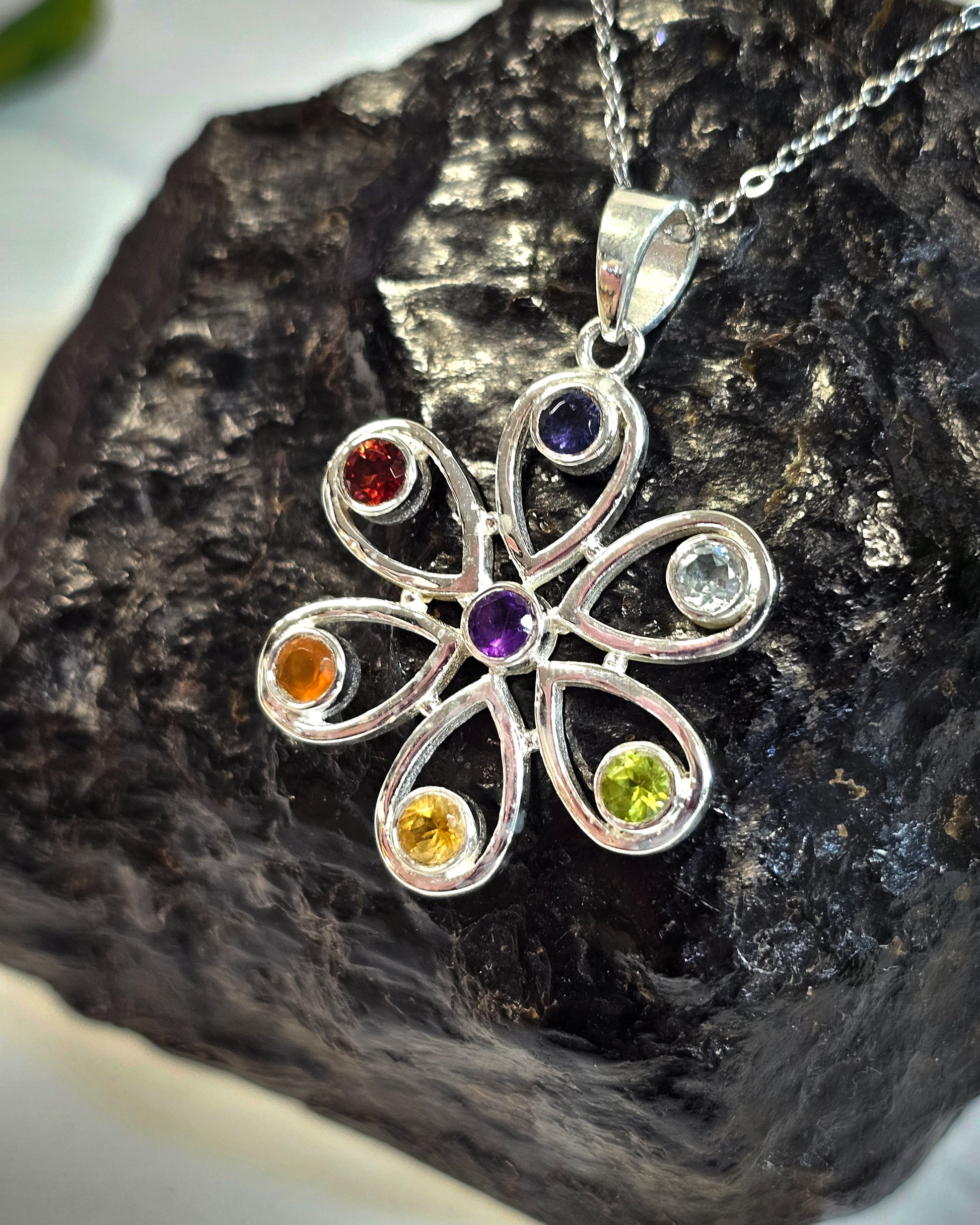 A truly stunning pendant with 7 crystals representing the 7 chakras, set in sterling silver.