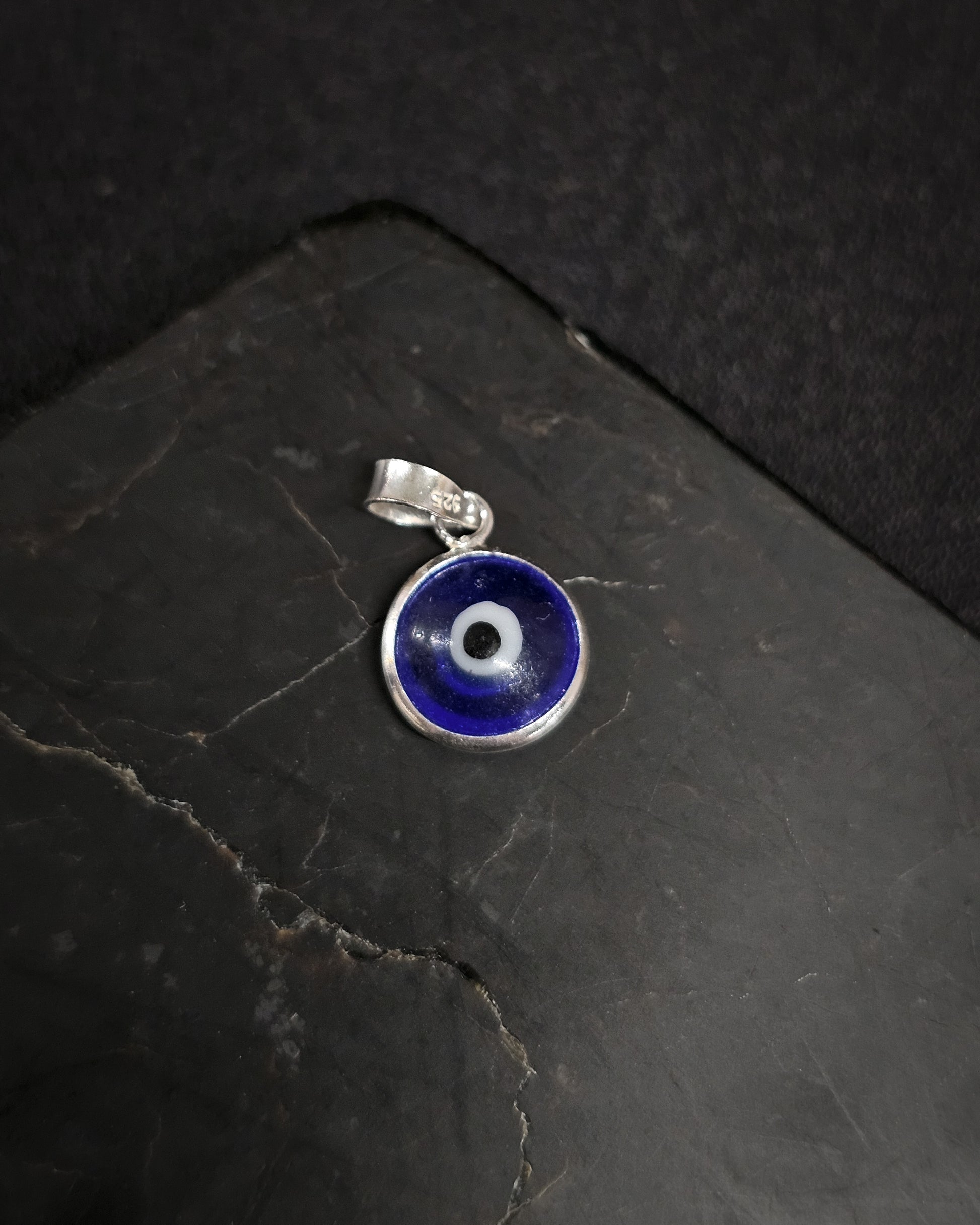 Glass Evil Eye pendant set in 92.5 sterling silver.