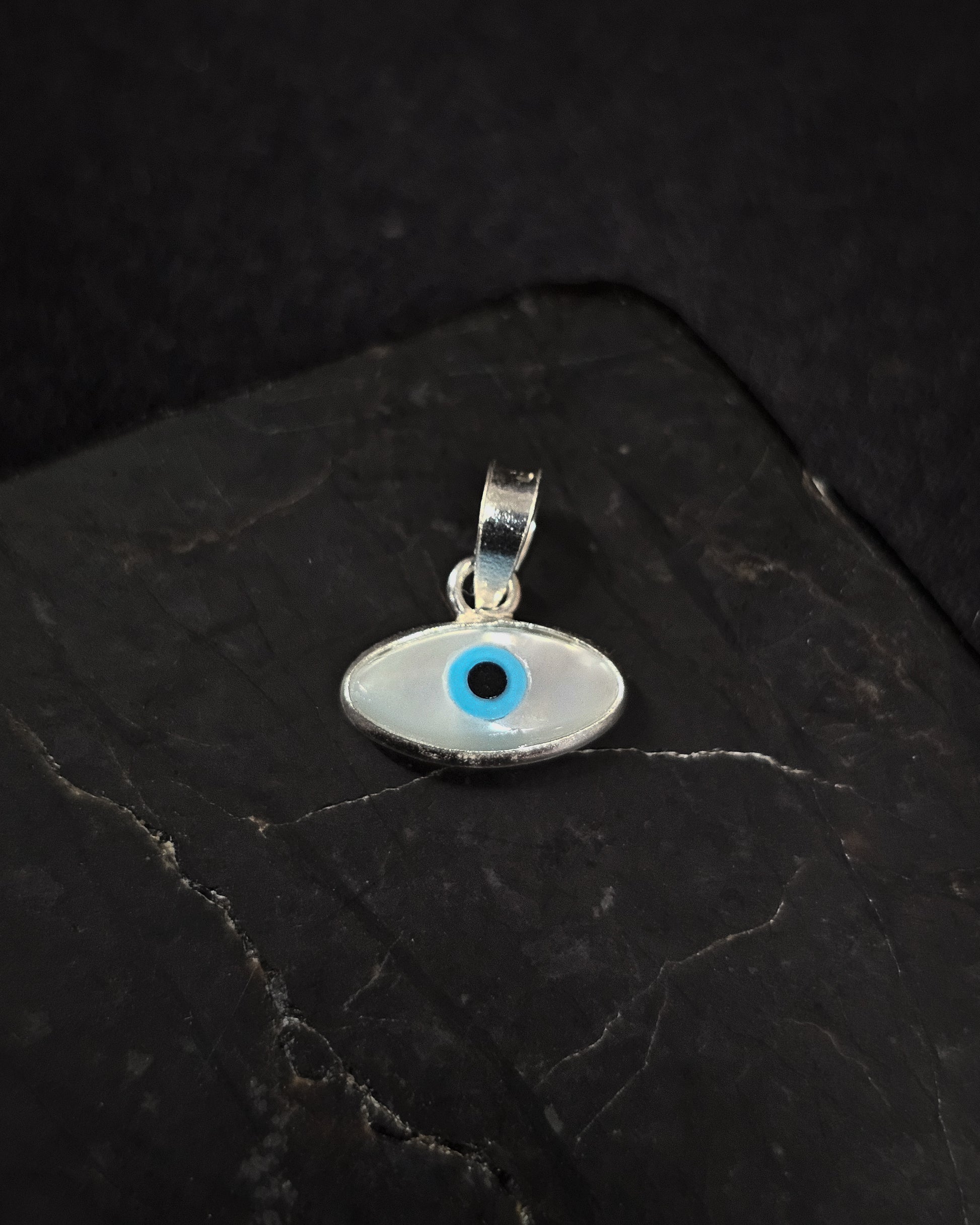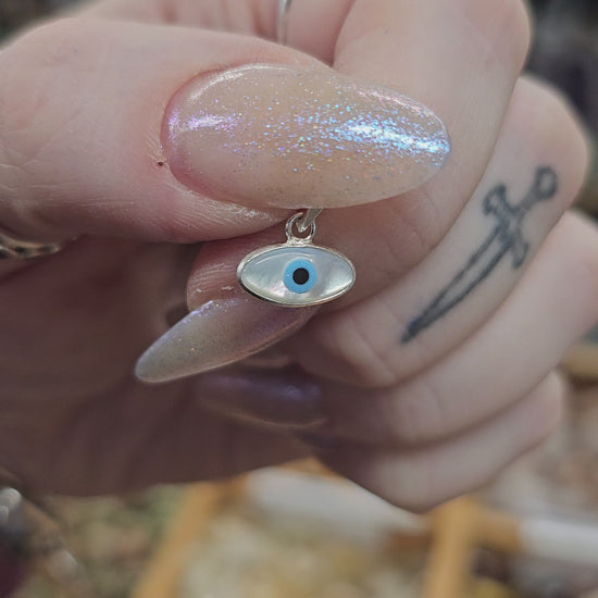 Mother of Pearl Evil Eye pendant set in 92.5 sterling silver.