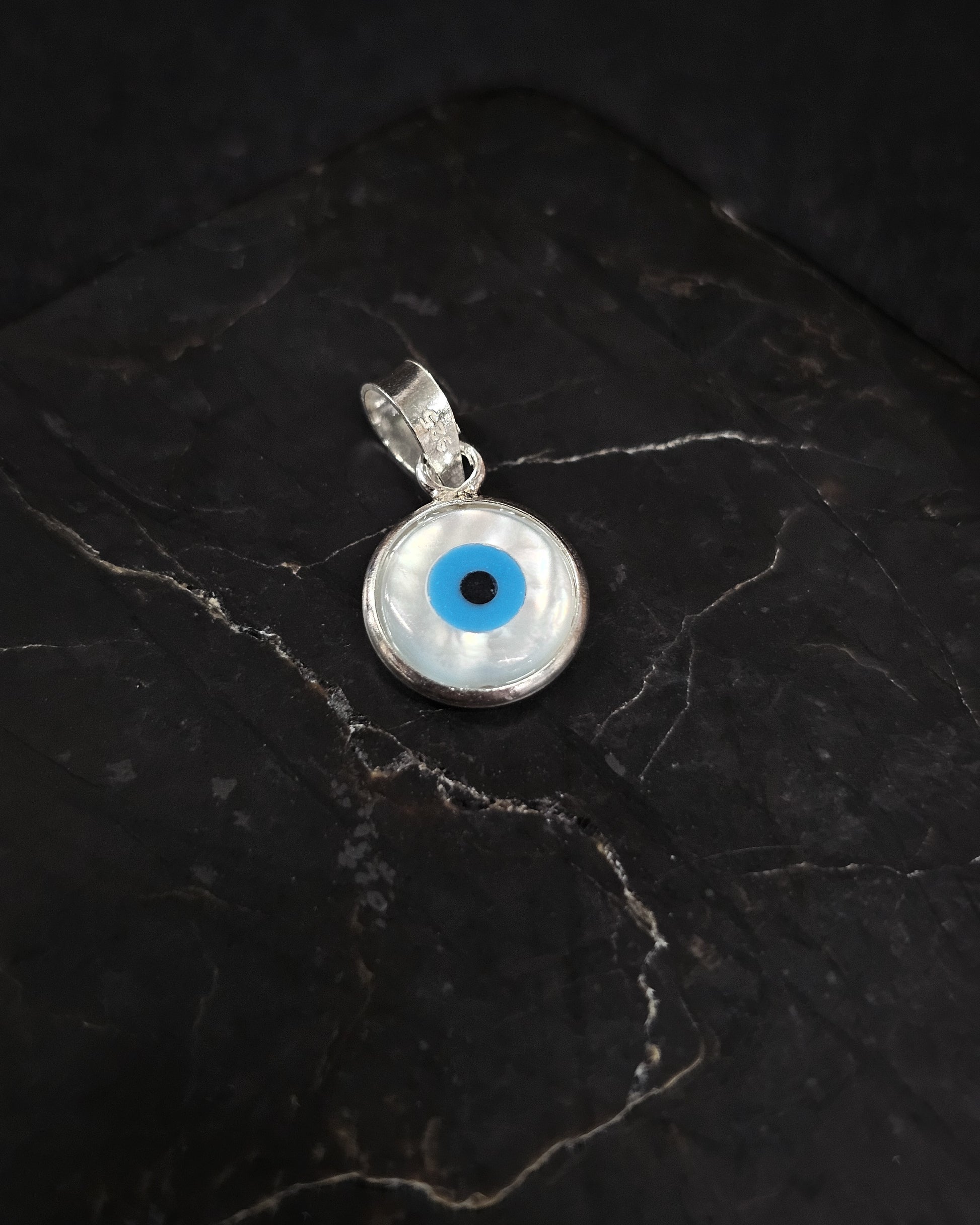 Mother of Pearl Evil Eye pendant set in 92.5 sterling silver.