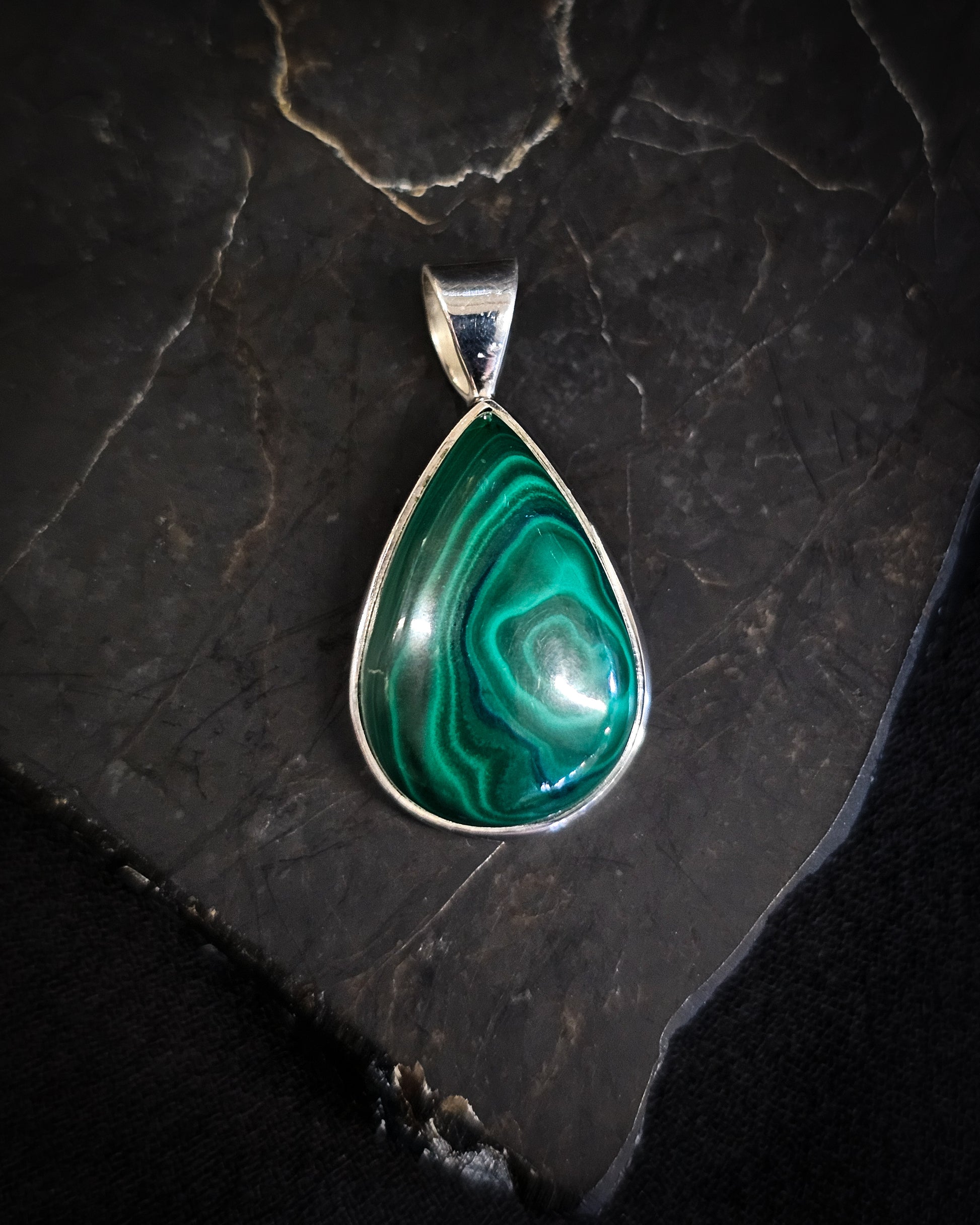 A stunning Malachite Teardrop pendant set in 92.5 sterling silver