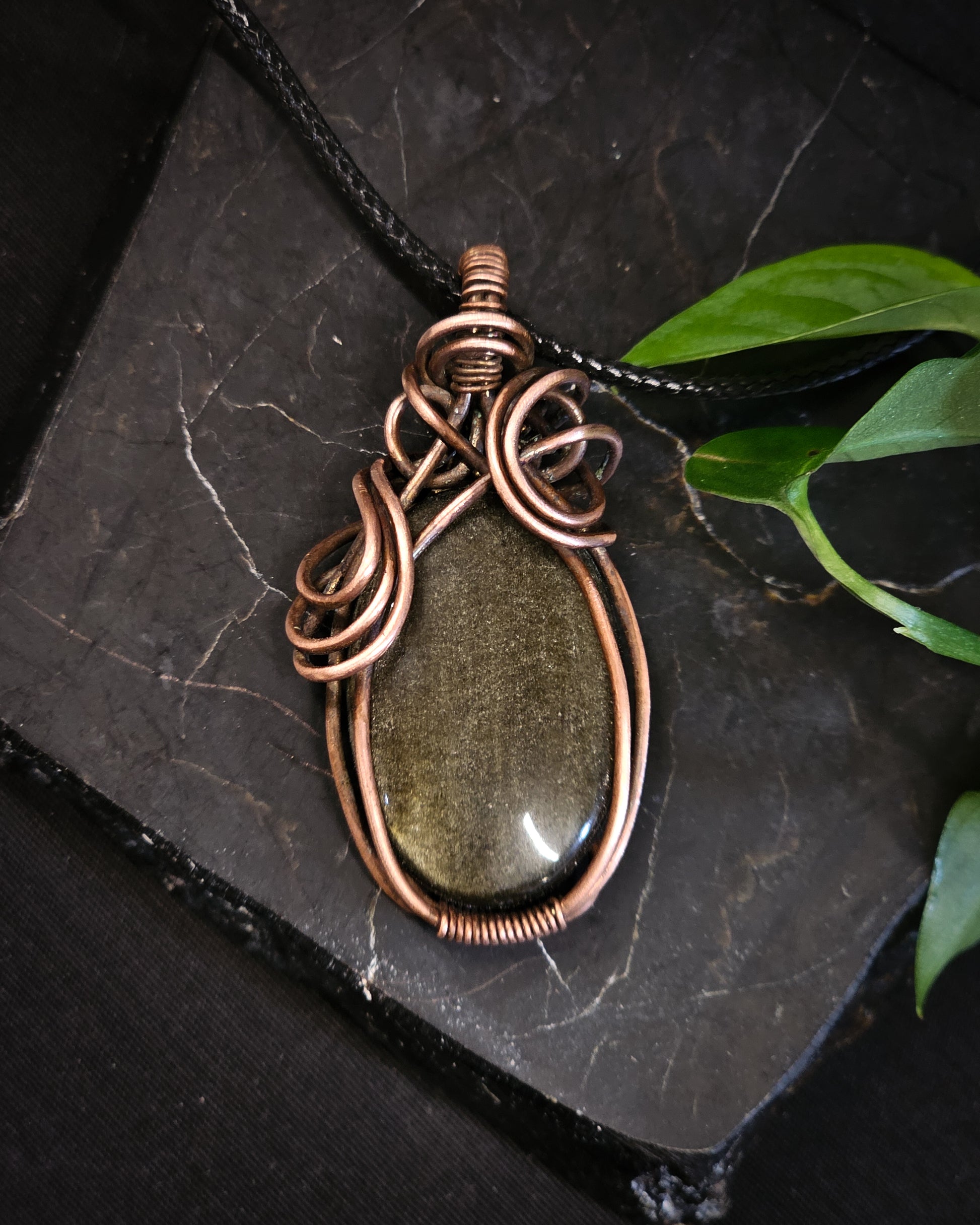 Copper Wrapped Gold Sheen Obsidian Pendant