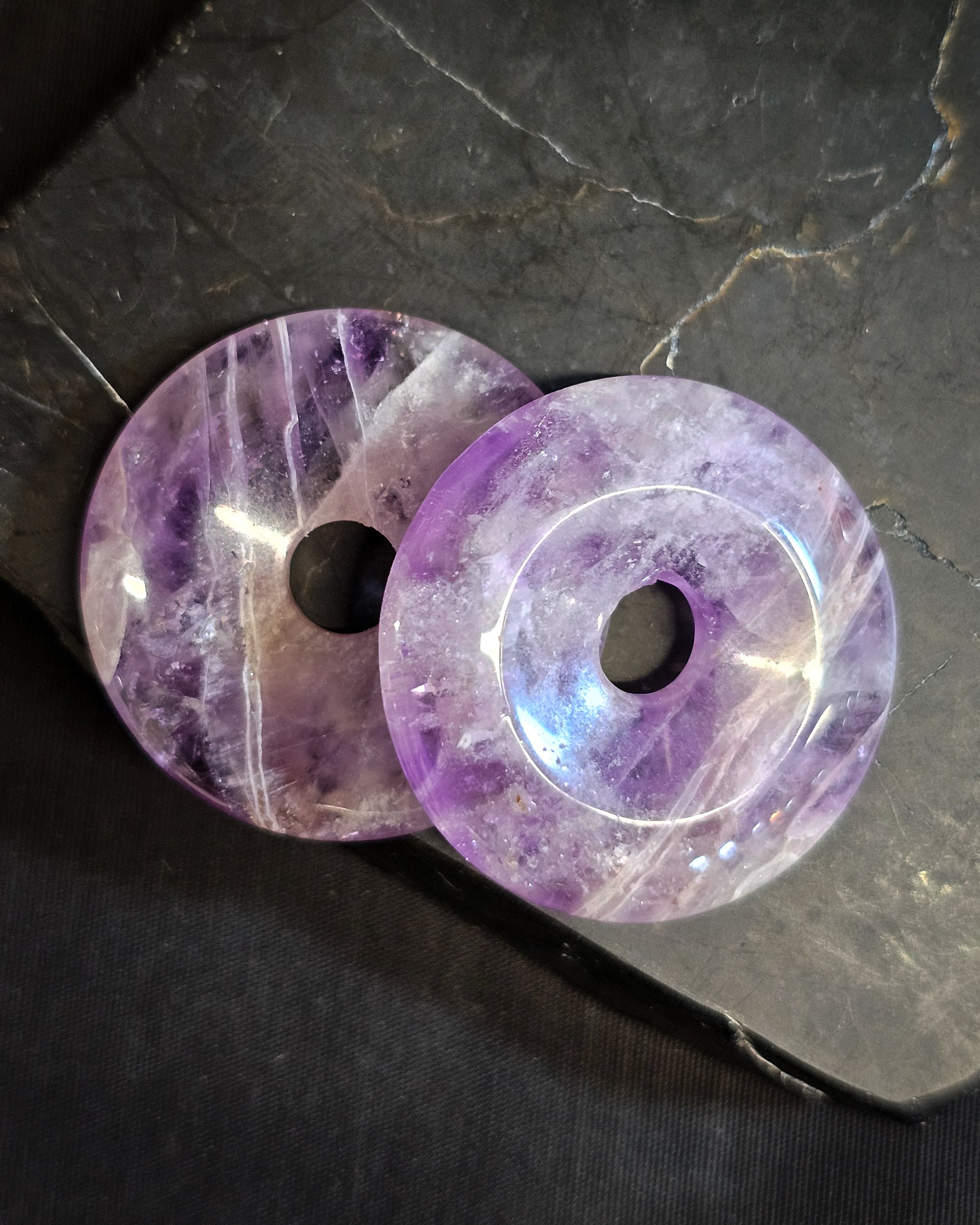 Pi stones, also known as donut stones, are circular gemstones featuring a central hole, symbolizing unity, balance, and the interconnectedness of life. With roots in various spiritual traditions, they are revered for their energetic and metaphysical properties. The unique shape represents wholeness, with the hole in the center serving as a passageway for energy flow or spiritual connection.