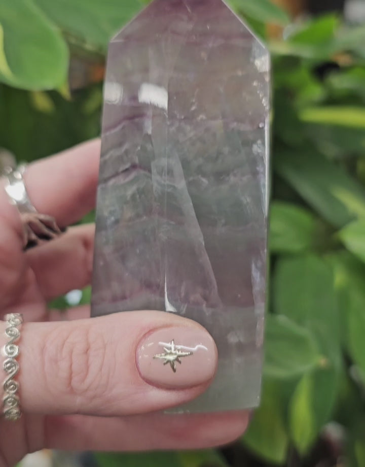 A stunning Rainbow Fluorite point with green and purple banding throughout.