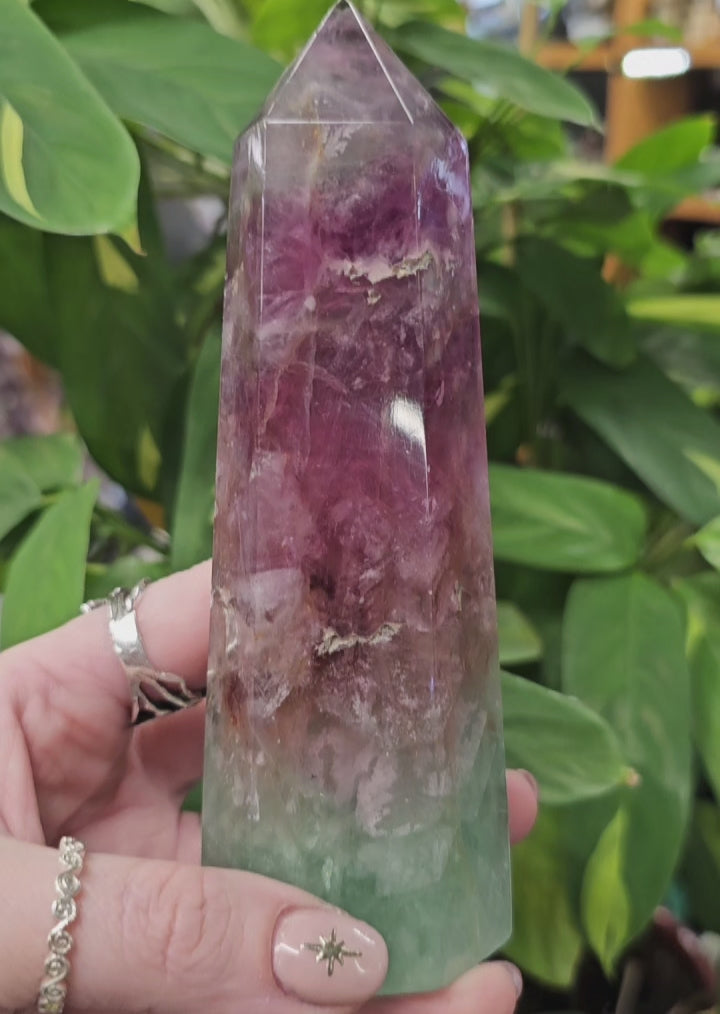 A stunning Rainbow Fluorite point with a green base turning into purple at the top
