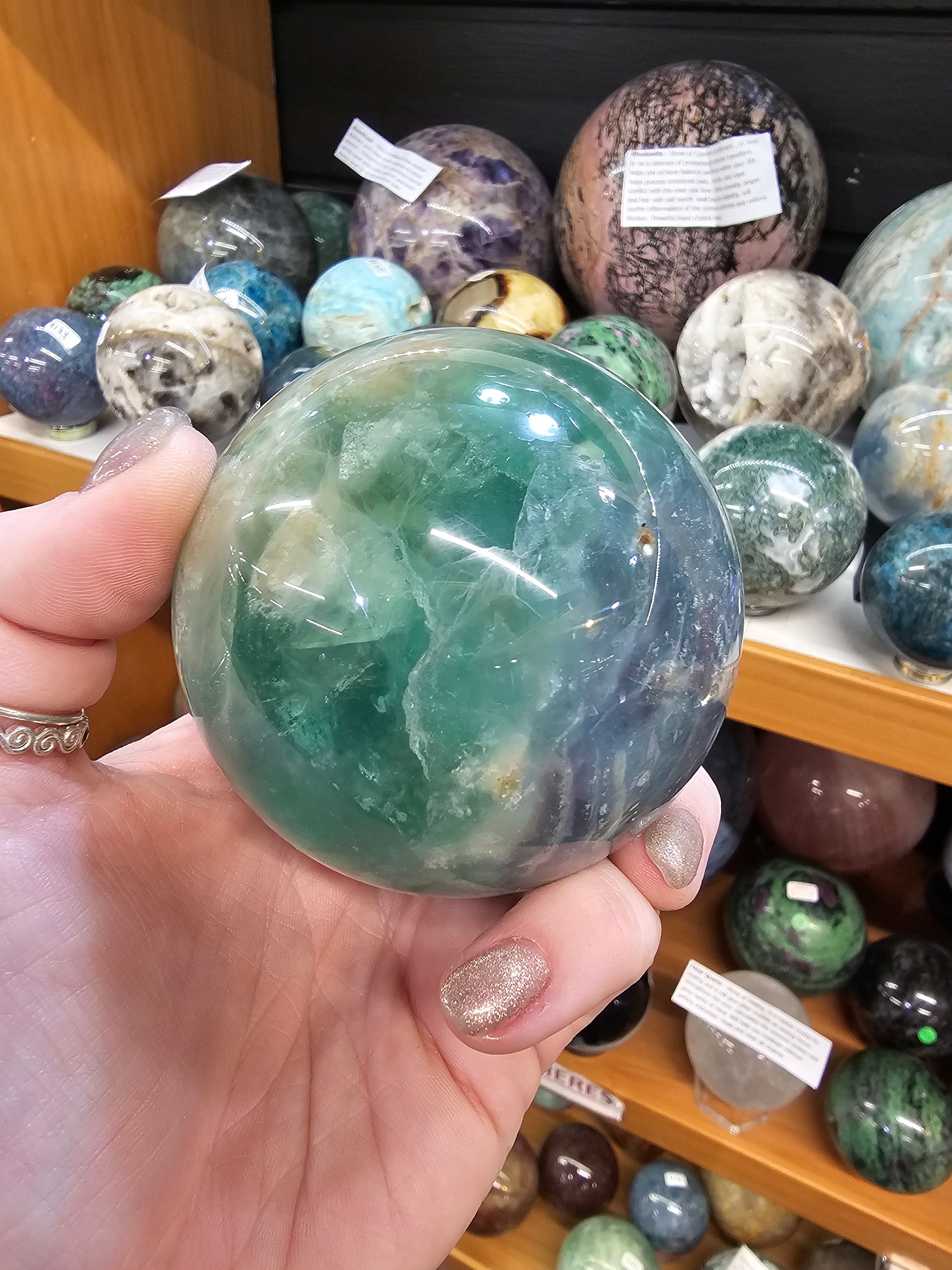 A stunning Rainbow Fluorite sphere showing predominantly green with a beautiful slice of purple.