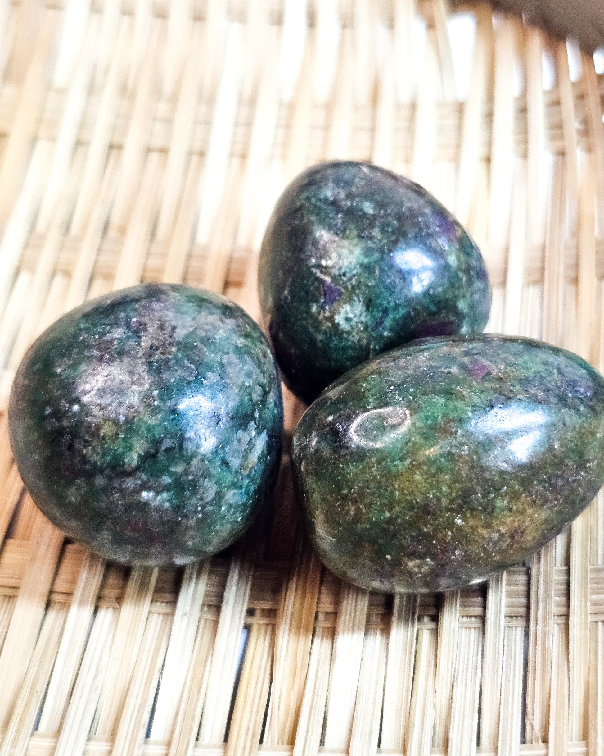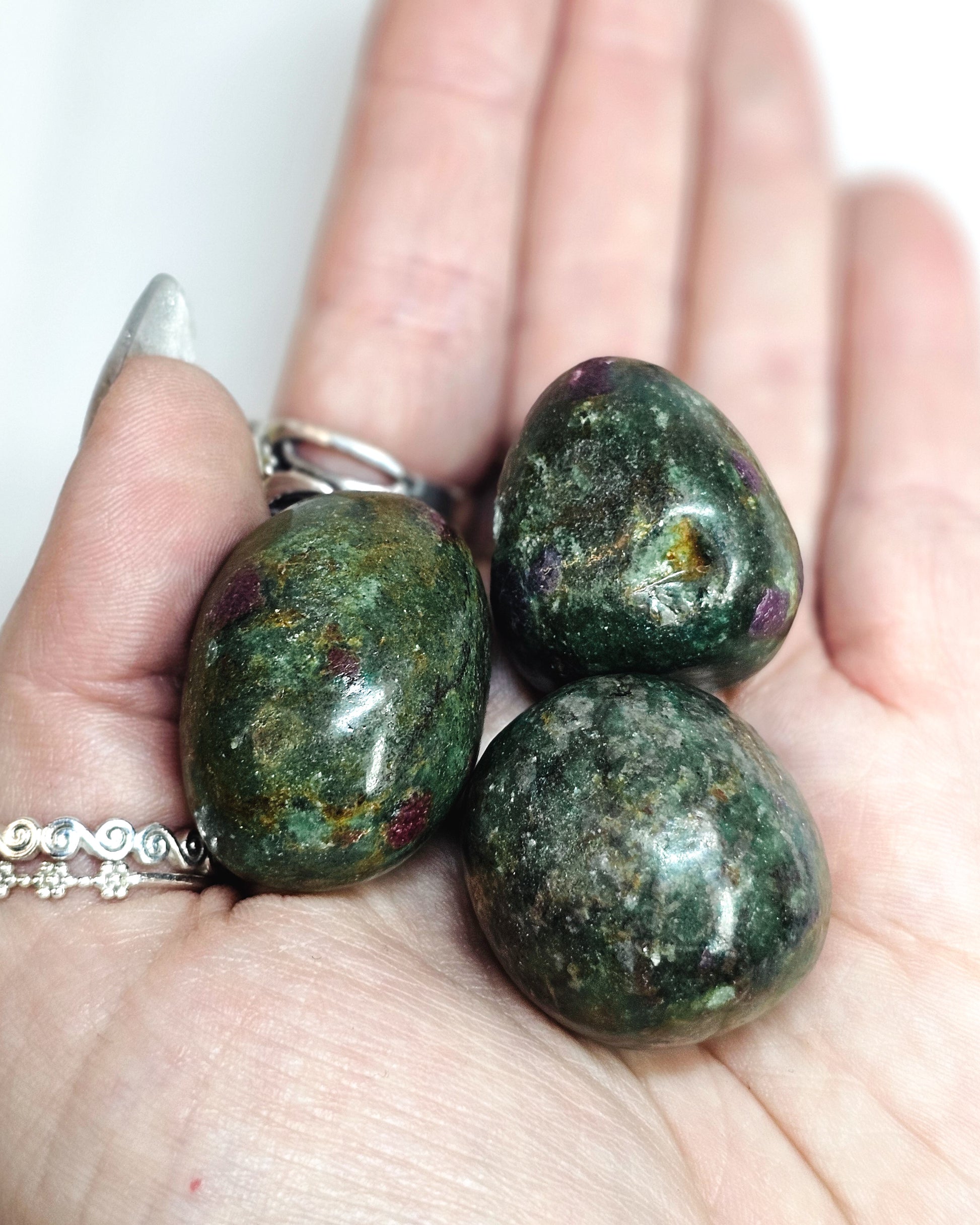 Ruby in Fuchsite - Stone of self reflection and courage. Helps one bounce back after emotional upset, gaining a more logical perspective on the situation. Wear to regenerate passion for life, replacing blocks with attainable goals and dreams. Heart chakra.