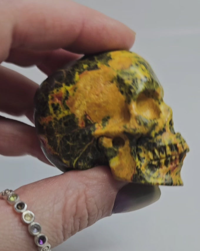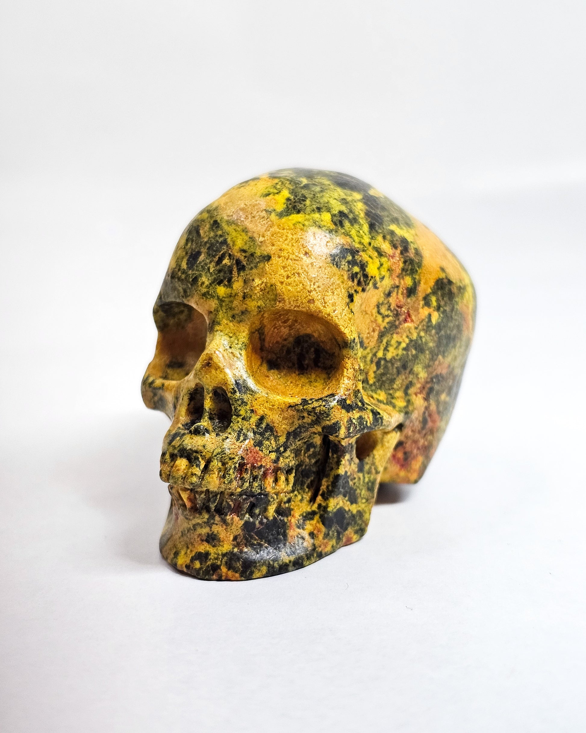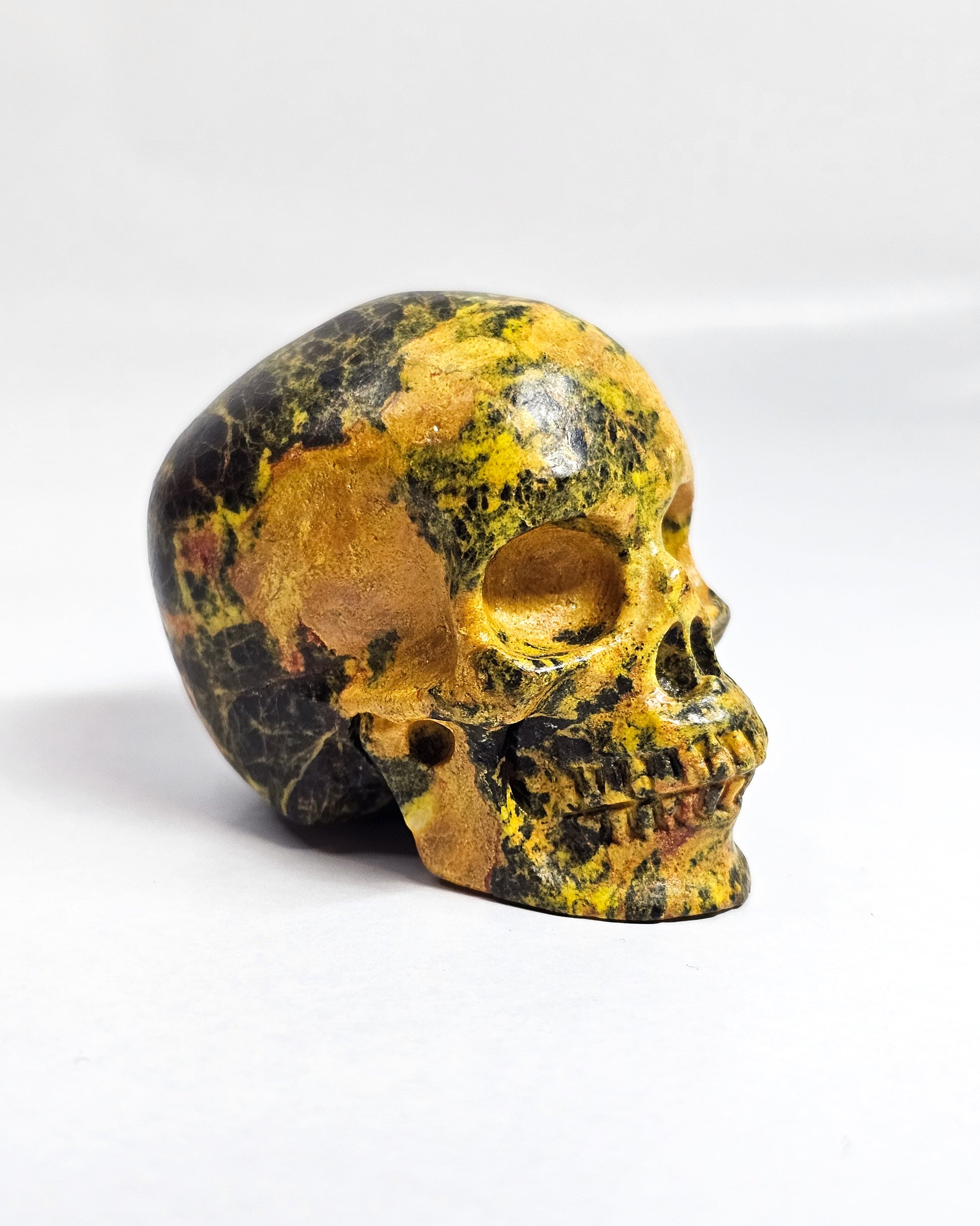 An incredibly detailed handcarved skull made from Bumblebee Jasper