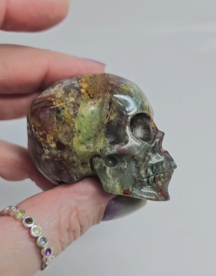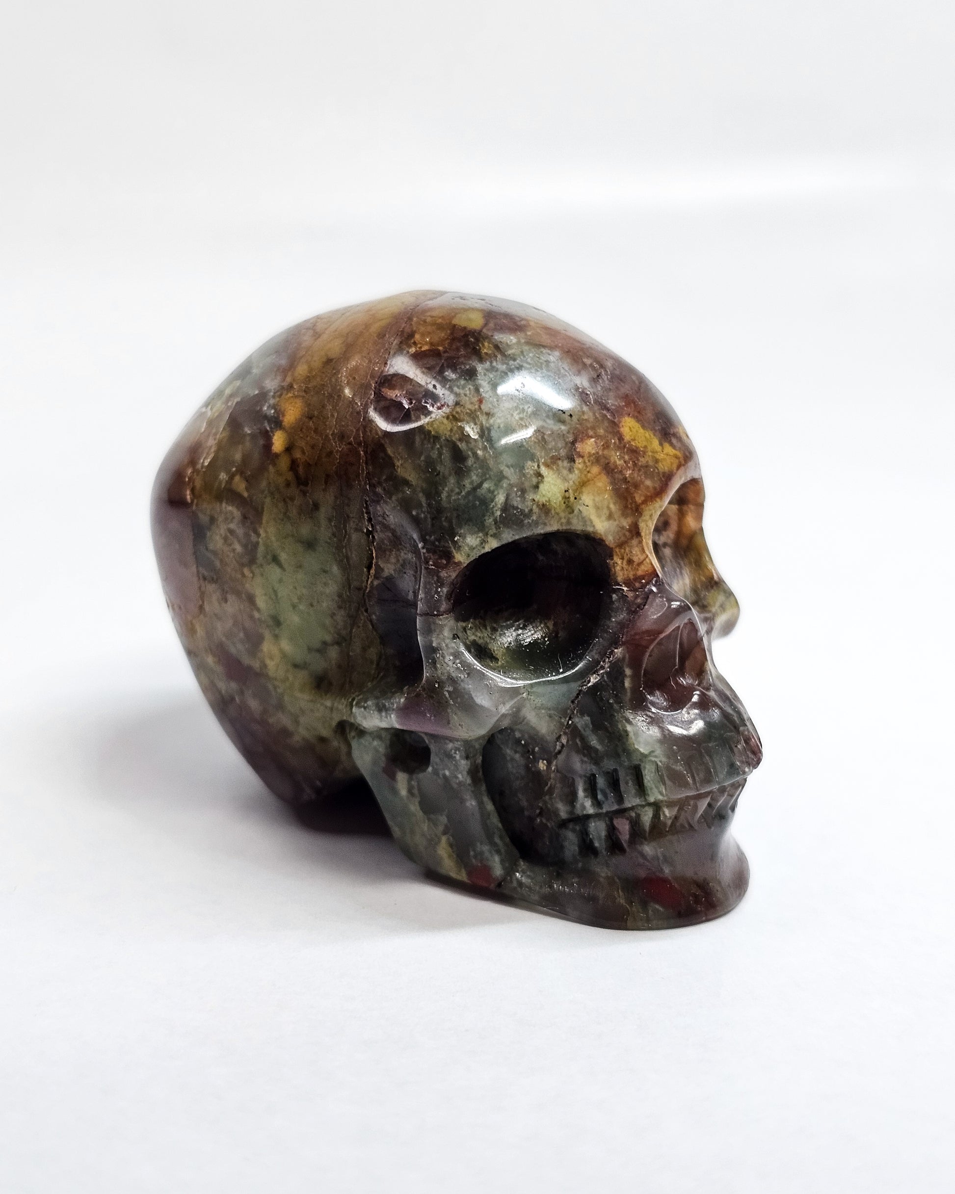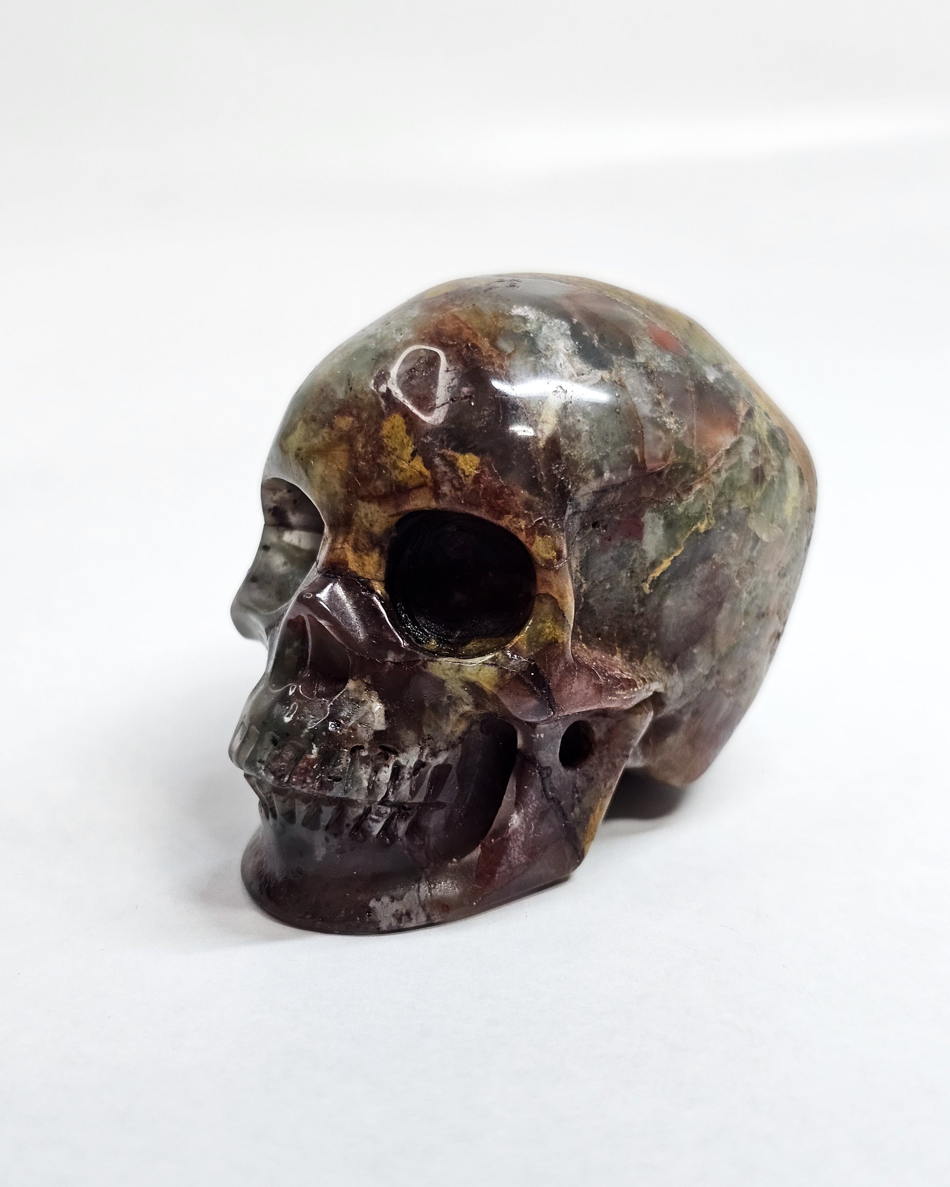 An incredibly detailed handcarved skull made from Brecciated Jasper